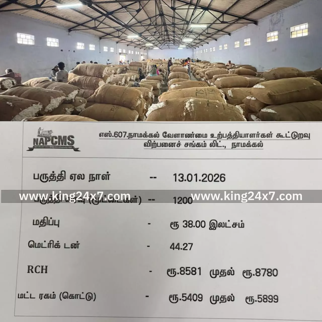 Namakkal King 24x7 |13 Jan 2026 8:26 PM ISTஅண்டை மாவட்டங்களில் இருந்தும் விவசாயிகள் 1200 மூட்டை பருத்தியை விற்பனைக்கு கொண்டு வந்து இருந்தனர்.இந்த பருத்தி மூட்டைகள் ரூ.38 லட்சத்துக்கு விற்பனையானது