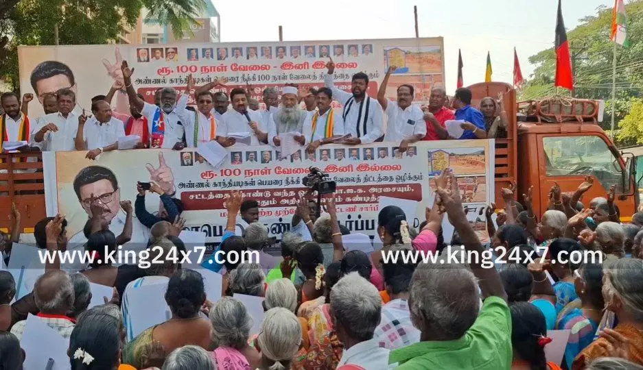 மகாத்மா காந்தி தேசிய ஊரக வேலை உறுதியளிப்புச் சட்டத்தை சிதைத்து, அதன் திட்டப் பணிகளை சீர்குலைத்து, நிதி ஒதுக்கீட்டை குறைப்பது என இயங்கும் மத்திய பாஜக அரசின் செயலையும்-அதற்கு உறுதுணையாக இருக்கும் அதிமுகவையும் கண்டித்தும், சட்டத்தை திரும்பப் பெற வலியுறுத்தியும் இன்று தமிழகம் முழுவதும் உள்ள ஊராட்சி ஒன்றிய அலுவலகம் முன்பு மதசார்பற்ற முற்போக்கு கூட்டணி கட்சியினர் கண்டன ஆர்ப்பாட்டத்தில் ஈடுபட்டனர்.அதே போல நாமக்கல்லில் மோகனூர் சாலையில் உள்ள ஊராட்சி ஒன்றிய அலுவலகம் முன்பு மாநிலங்களவை உறுப்பினரும், கிழக்கு மாவட்ட திமுக செயலாளருமான ராஜேஷ்குமார் தலைமையில் கண்டன ஆர்ப்பாட்டம் நடைபெற்றது. இந்த ஆர்ப்பாட்டத்தில் ஏராளமானோர் கலந்து கொண்டு ஒன்றிய அரசுக்கு எதிராக கண்டன முழக்கங்களை எழுப்பினர்.இந்த ஆர்ப்பாட்டத்தில் திமுக எம்.பி.ராஜேஷ்குமார் பேசுகையில் மாநிலங்களவையில் 100 நாள் வேலை திட்ட மசோதா கொண்டு வந்த போது அதனை ஆதரித்து அதிமுக வாக்கெடுப்பில் பங்கேற்றது. ஜெயலலிதா இருந்திருந்தால் 100 நாள் வேலை திட்ட மசோதாவை எதிர்த்து போராடி இருப்பார், கொடநாடு கொலை வழக்கு விசாரணையில் இருந்து தப்பிக்கவே பாஜகவுடன் எடப்பாடி பழனிசாமி கூட்டணி வைத்துள்ளார் பேசினார்.