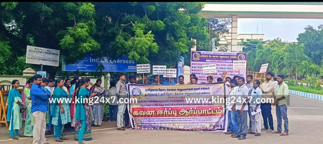கரூரில், UATT 2.0 திட்டத்தினை கைவிட வலியுறுத்தி தமிழ்நாடு தோட்டக்கலை மற்றும் உதவி தோட்டக்கலை அலுவலர்கள் சங்கம் சார்பில் கவன ஈர்ப்பு ஆர்ப்பாட்டம். கரூர் மாவட்ட ஆட்சியர் அலுவலகம் முன்பு தமிழ்நாடு தோட்டக்கலை அலுவலர்கள் நலச்சங்கம் மற்றும் தமிழ்நாடு உதவி தோட்டக்கலை அலுவலர்கள் சங்கம் சார்பில் கோரிக்கைகளை வலியுறுத்தி அலுவலர்கள் நல சங்கத்தின் மாவட்ட செயலாளர் தமிழ்ச்செல்வி மற்றும் உதவி அலுவலர்கள் சங்க மாவட்ட தலைவர் அருள்செல்வன் தலைமையிலும் ஆர்ப்பாட்டம் நடைபெற்றது. இந்த ஆர்ப்பாட்டத்தில் கரூர் மாவட்ட அனைத்து தோட்டக்கலை உதவி இயக்குனர்கள் தோட்டக்கலை உதவி அலுவலர்கள் கலந்து கொண்டு தங்களது கோரிக்கைகளை வலியுறுத்தி கோஷங்களை எழுப்பினர். கடந்த 1979 ஆம் ஆண்டு தோட்டக்கலை துறையின் வளர்ச்சி மற்றும் தனித்துவத்தை கருத்தில் கொண்டு தனித்துறையாக மாற்றப்பட்டது. பிறகு 2007 ஆம் ஆண்டு அப்போதைய தமிழக முதல்வர் கருணாநிதி அவர்களால் தோட்டக்கலைத் துறையில் மறு சீரமைப்பு செய்யப்பட்டது. இதனால் 100 ஏக்கர் பரப்பளவில் சாகுபடி செய்யப்படும் தோட்டக்கலை பயிர்களில் இருந்து கிடைக்கும் உற்பத்தி மற்றும் வருமானம் 1000 ஏக்கர் பரப்பளவில் சாகுபடி செய்யப்படும் தானிய பயிர்களில் உற்பத்தி மற்றும் வருமானத்தை விட 20 முதல் 30 மடங்கு அதிகமாக வந்தது. ஐந்து முதல் 10 சென்ட் பரப்பளவில் மேற்கொள்ளப்படும் தோட்டக்கலை பயிர்களில் சாகுபடி தொழில் நுட்பங்களை தோட்டக்கலை பட்டய படிப்பு படித்த கள அலுவலர்களால் மட்டுமே வழங்க முடியும். இந்நிலையில் தோட்டக்கலைத் துறையில் தமிழக அரசின் வேளாண்மை உழவர் நல துறையால் தற்பொழுது கொண்டுவரப்பட்டுள்ள UATT 2.0 திட்டத்தால் விவசாயிகள் பாதிக்கப்பட்டு உள்ளனர். எனவே தோட்டக்கலை துறை வளர்ச்சியினை உறுதிப்படுத்த தமிழக அரசு UATT 2.0 திட்டத்தை கைவிட வலியுறுத்தி கவன ஈர்ப்பு ஆர்ப்பாட்டத்தில் ஈடுபட்டனர்.